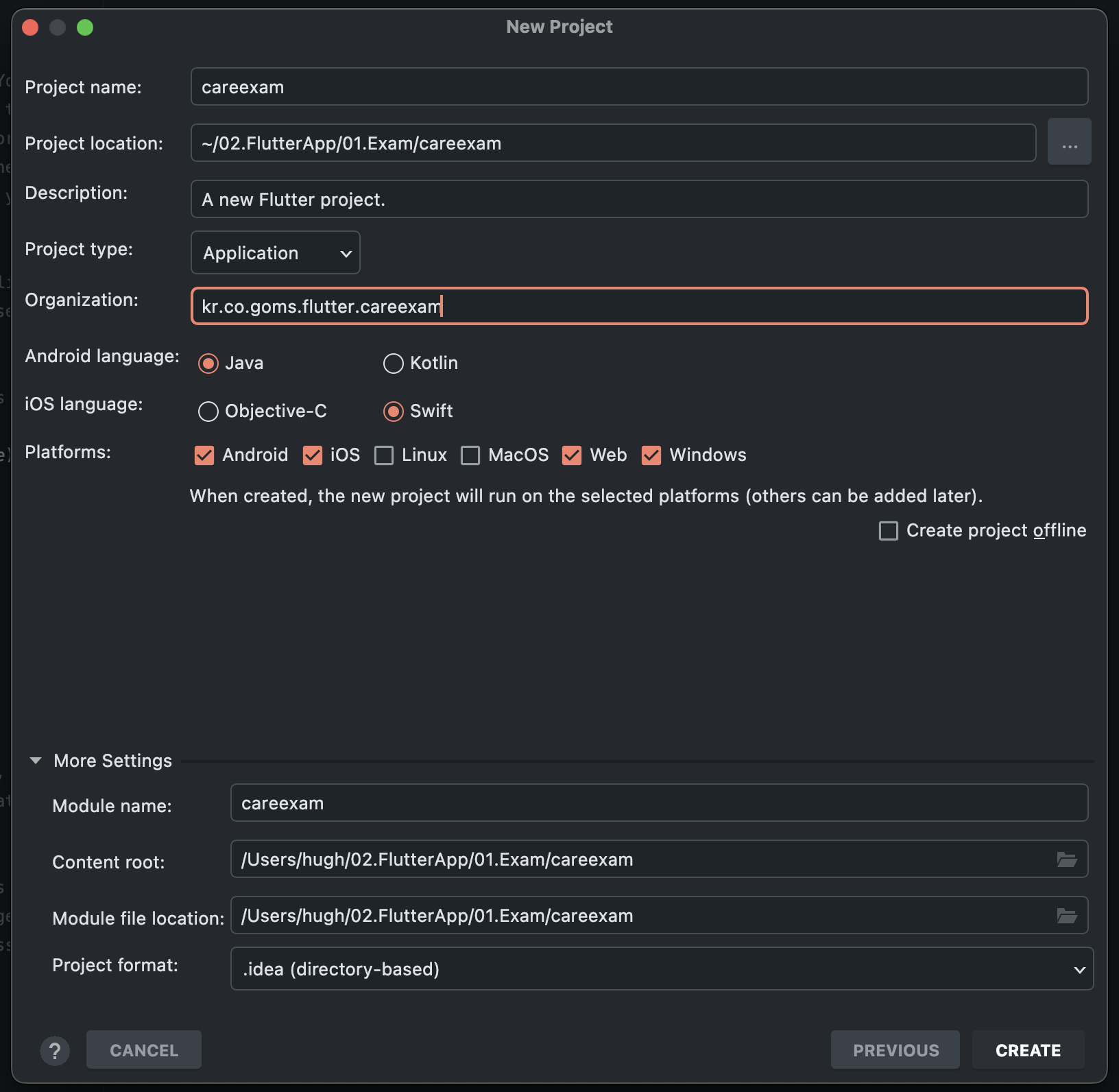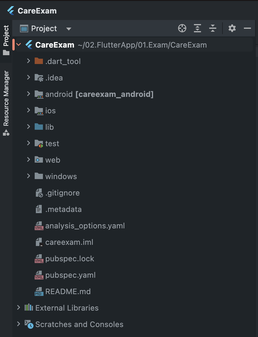 2)Project location : ~/02.FlutterApp/01.Exam/careexam
