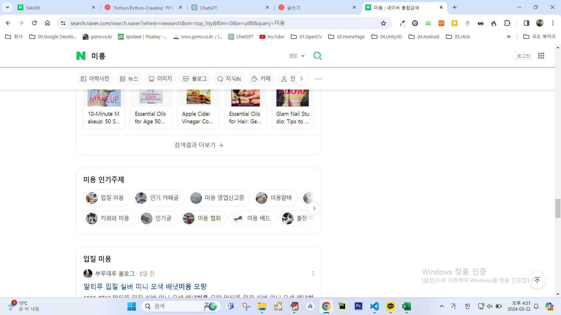 1)브라우저에 url을 "https://search.naver.com/search.naver?where=nexearch&sm=top_hty&fbm=0&ie=utf8&query="+미용