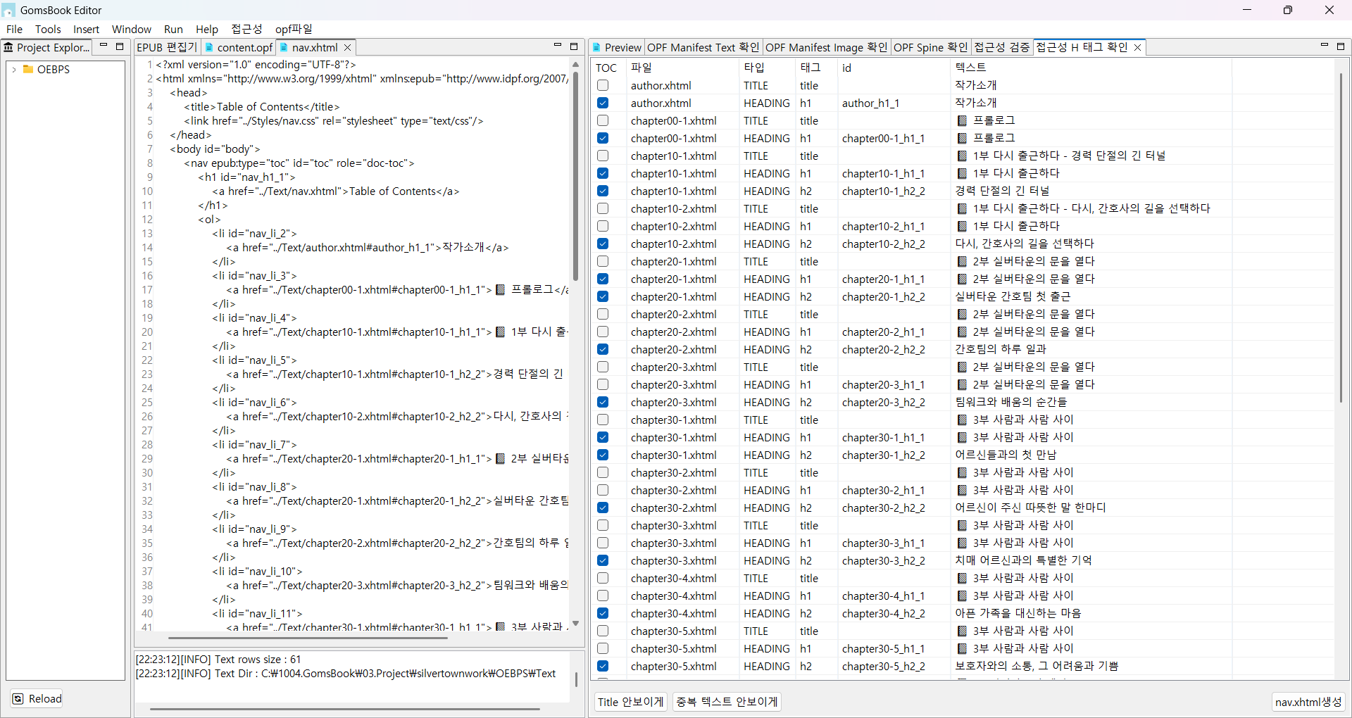 각 페이지의 Title과 H1를 분석해서 리스트를 보여줍니다. 사용자는 그냥 목차에 반영할 항목을 선택하고 "nav.xhtml생성" 버튼을 클릭하면 파일 생성 및 코드를 자동으로 반영됩니다.
