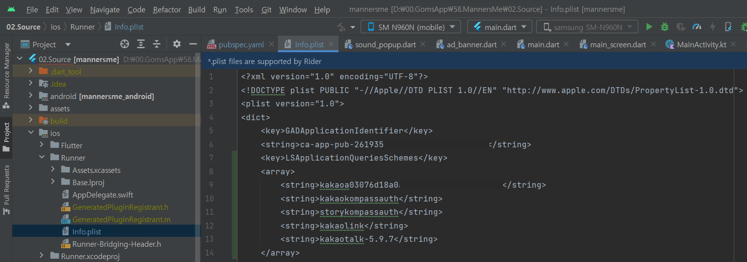 매너미 - MannersMe 앱 개발 수정 작업일지 #1 이 글을 읽으시는 분들 모두 추앙합니다. 1.매너미 - MannersMe 개발 환경 1)Flutter 개발환경 맞추기 ㄴ 전달받은 소스로 Flutter Project 실행 시, 실행이 되지 않음. 기존 개발 환경과 맞지 않다고 에러가 발생 ㄴ 신규 Flutter Project를 생성함 > 실행됨. 2)Flutter upgrade 진행 3)Flutter get, Flutter update 진행 Android 수정 1.settings.gradle 수정 include ":app" def localPropertiesFile = new File(rootProject.projectDir, "local.properties") def properties = ne..